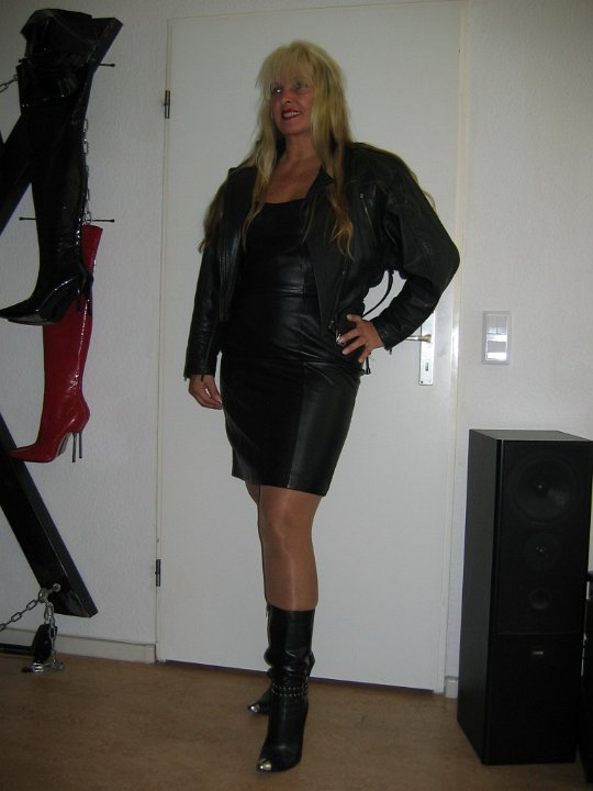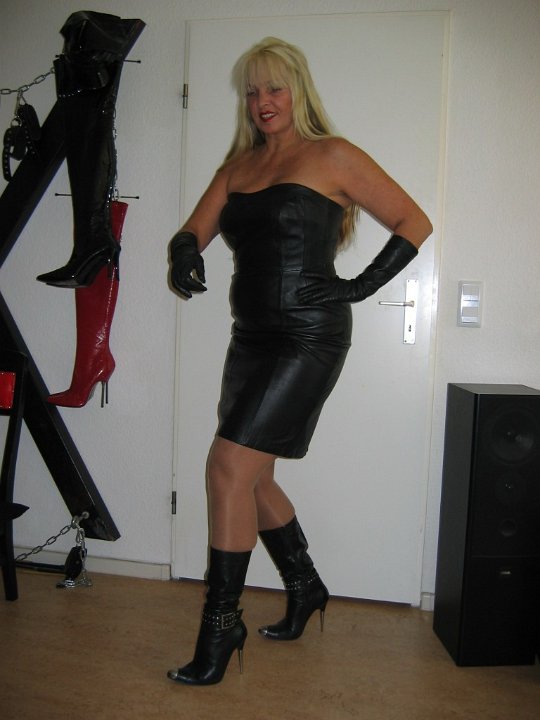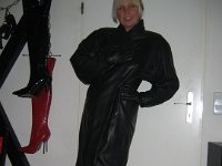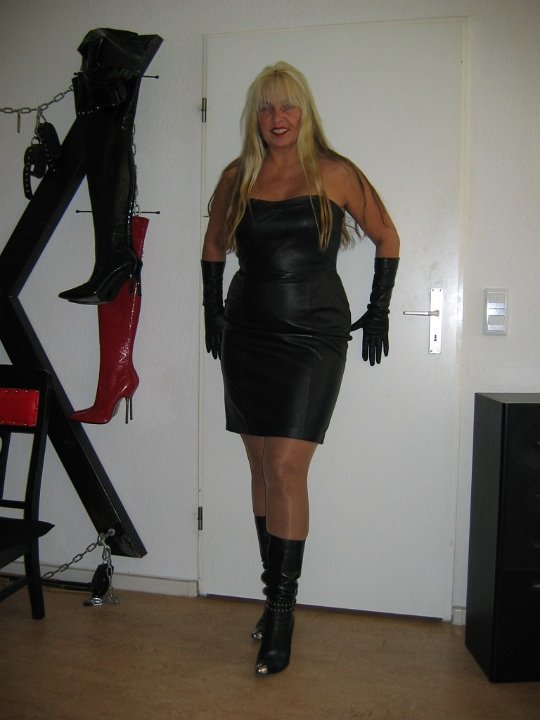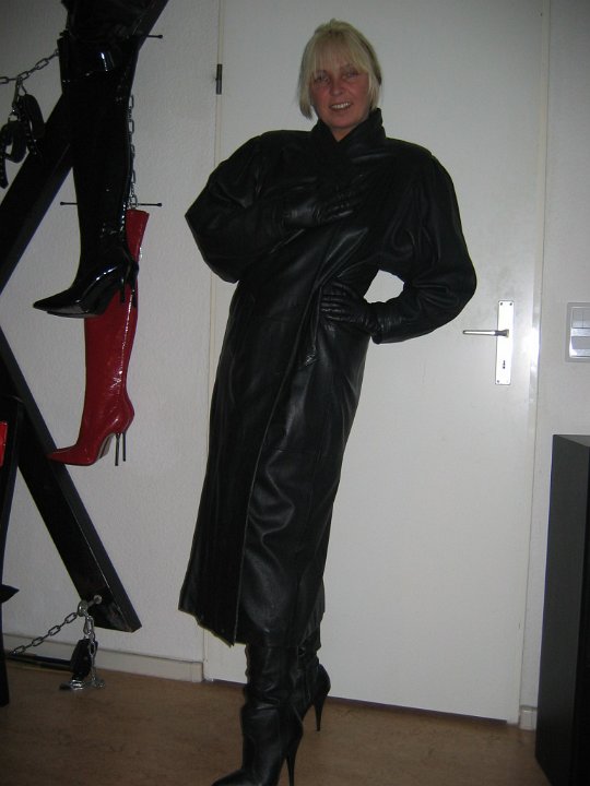 BDSM Lederoutfits, Dominabekleidung, Ledersession, Leder Overknee Siefel, Lederhandschuhe, Ledermantel
